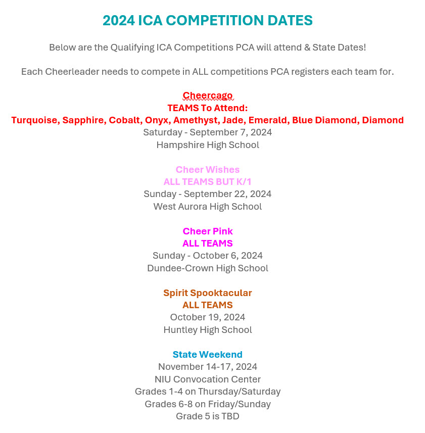 PCA is a proud member of Illinois Cheerleading Association (ICA) and follows all ICA rules. Our Coaching staff is experienced in Recreation cheer. With a Coaching staff collectively earning over 200 first place finishes at ICA Qualifying Competitions, making it to Top 3 at the ICA State Championship 6 years in a row on varying levels.